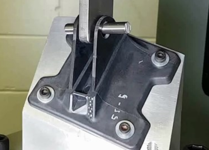 该支架有一个由PEEK树脂注塑成型制成的矩形底座,并带有两个嵌入底座中心的由碳纤维/PAEK材料制成的垂直嵌件行程插槽。底座的每个角落都有一个模制开孔,用于容纳紧固件实现固定。垂直嵌件顶部也都留有开孔,用于插入固定销和其他硬件。